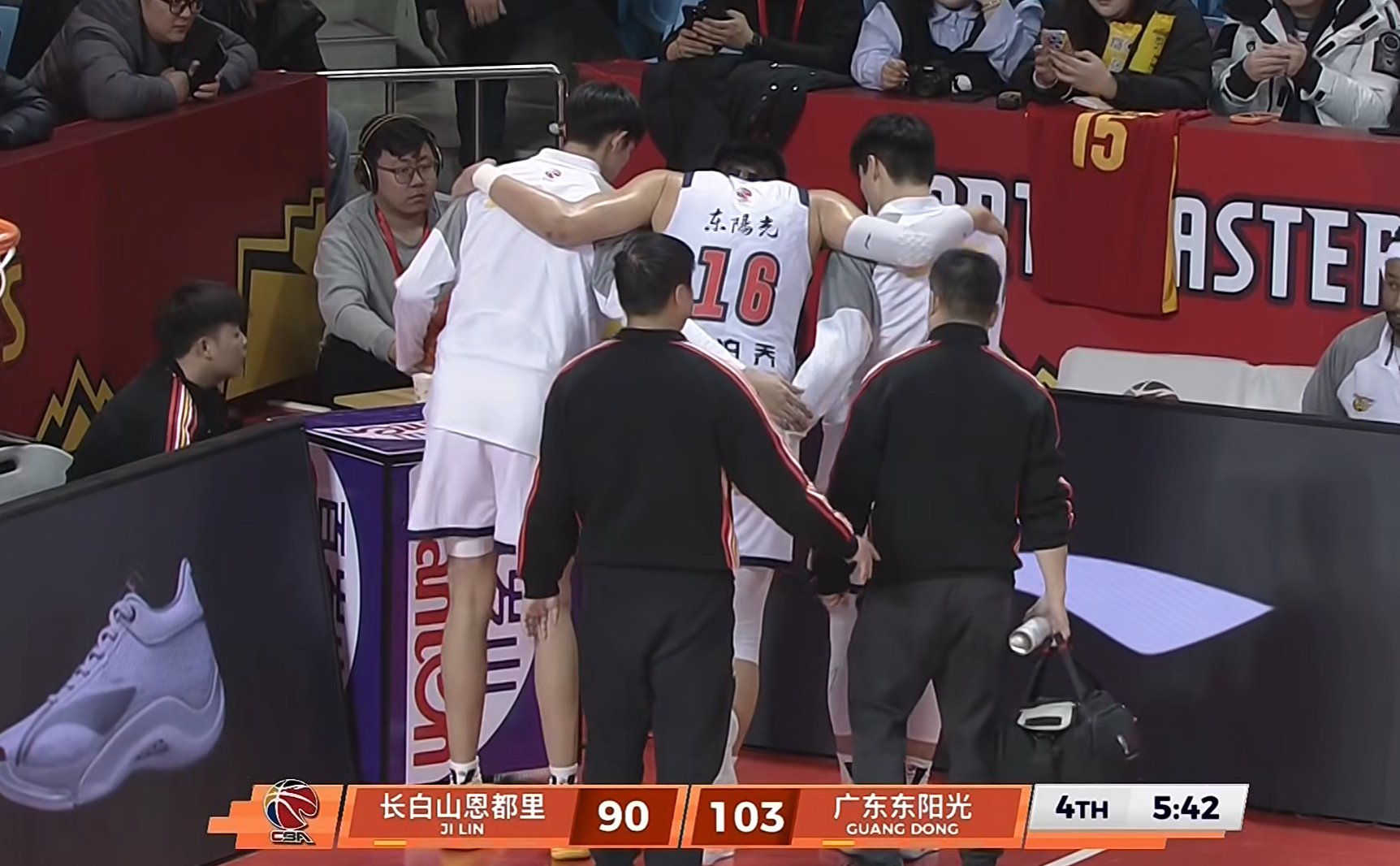 在第四节比赛,还有5分42秒的时候,广东队处于防守回合时,焦泊乔的脚挂到对方球员的脚,从而导致崴脚!我们可以看到,焦泊乔捂住自己的脚踝,显得十分痛苦。随后,队医也是快速入场,对他进行简单治疗。随后,焦泊乔被队友搀扶下场,左脚完全没有办法落地!